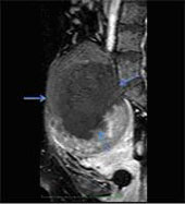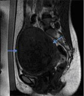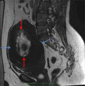 Fig. 1 – T2 weighted sagittal image showing a large fundal hypointense fibroid (blue arrows), with a central area of hyperintensity, representing internal degeneration (red arrows).