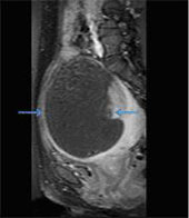 Fig. 2 - Post Contrast Fat Saturated T1 weighted sagittal image showing a large internal area of non-perfusion (arrows), which is the ablated area.
